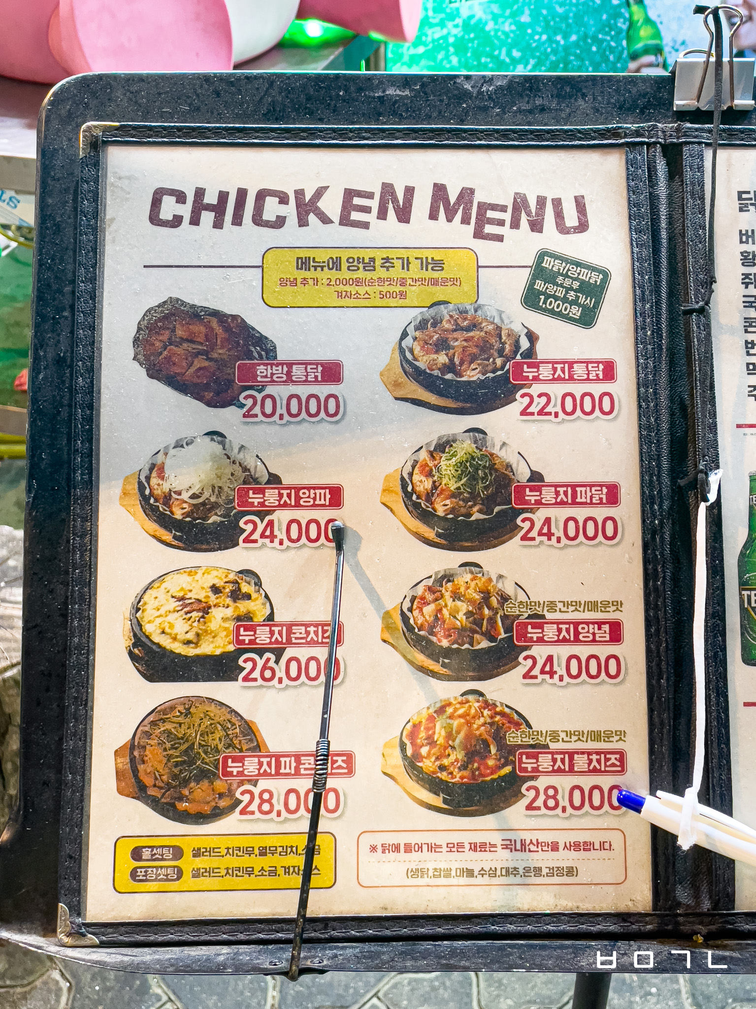 추천메뉴: 누룽지 파 콘치즈, 누룽지 파닭, 누룽지 양념 (맵기 선택 가능)