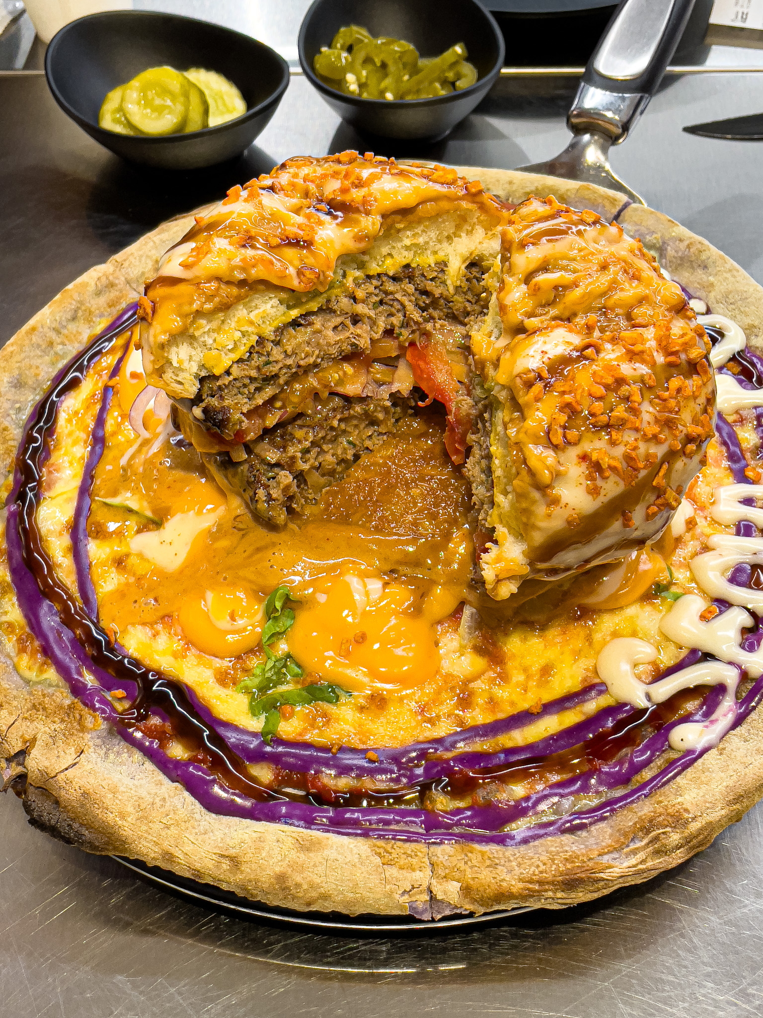 ㄴ피자 위에 햄버거타워가 올라간 피자