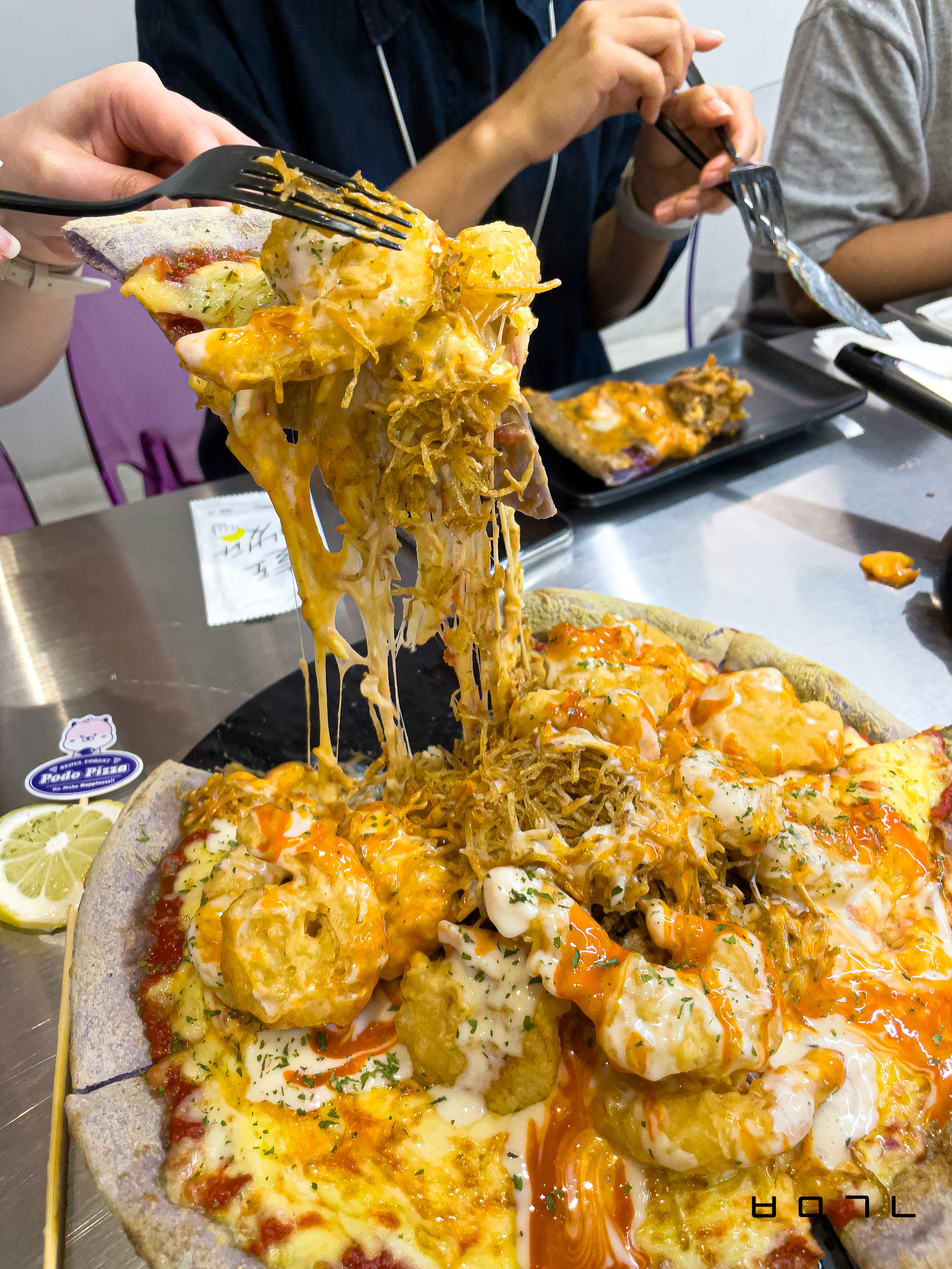 위에 보이는 피자는 소원의 폭포 크림새우피자이고,