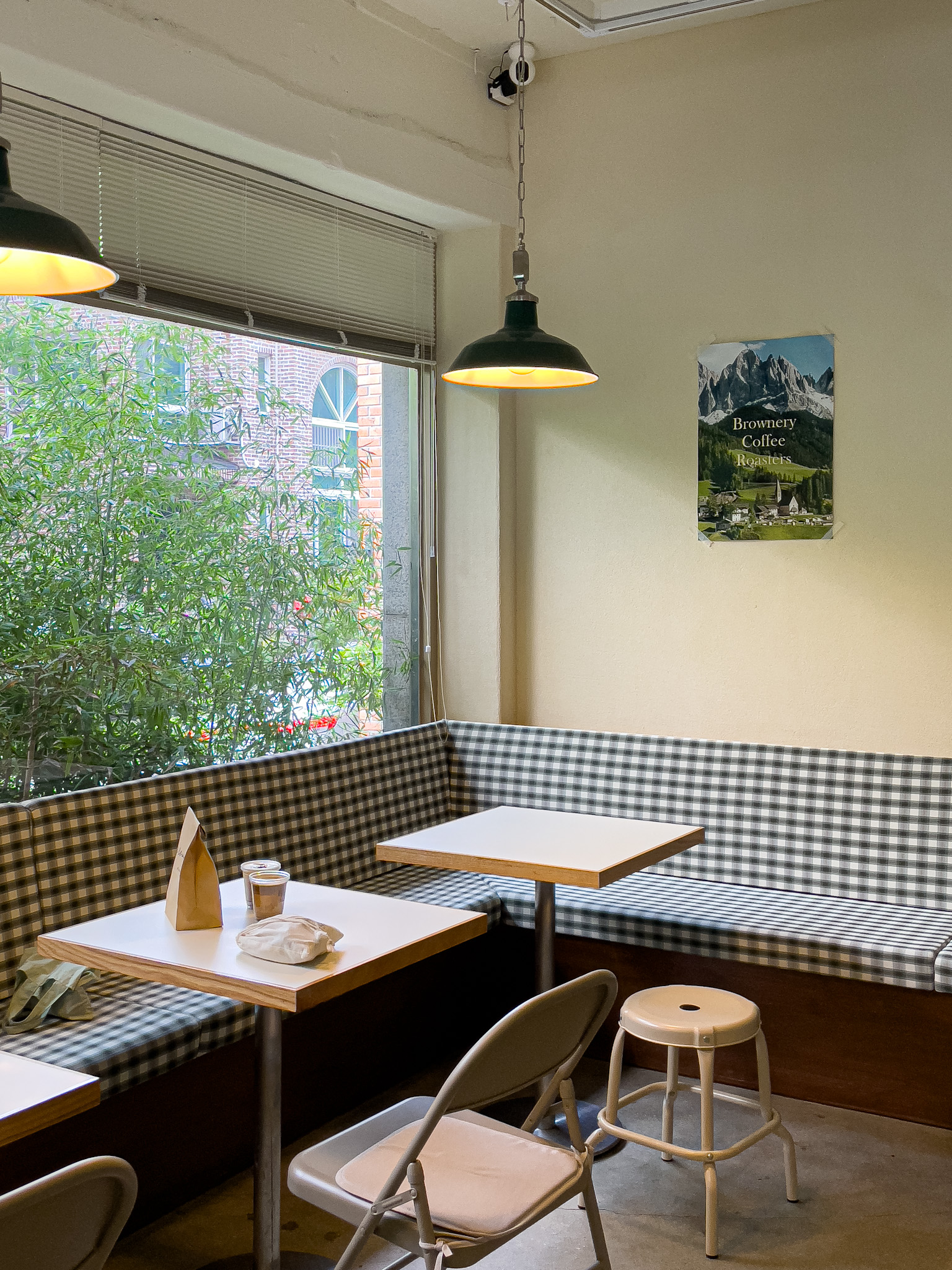 화이트& 베이지 색감과 우드가 조화롭게 잘 어우러져, 코지한 느낌을 주는 로스터리 카페 브라우너리