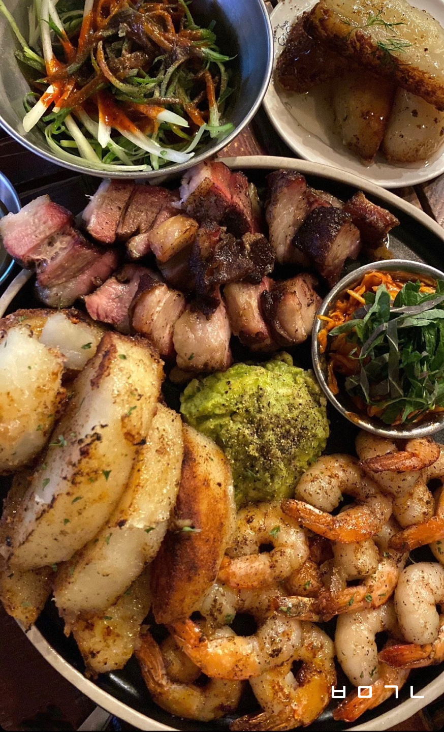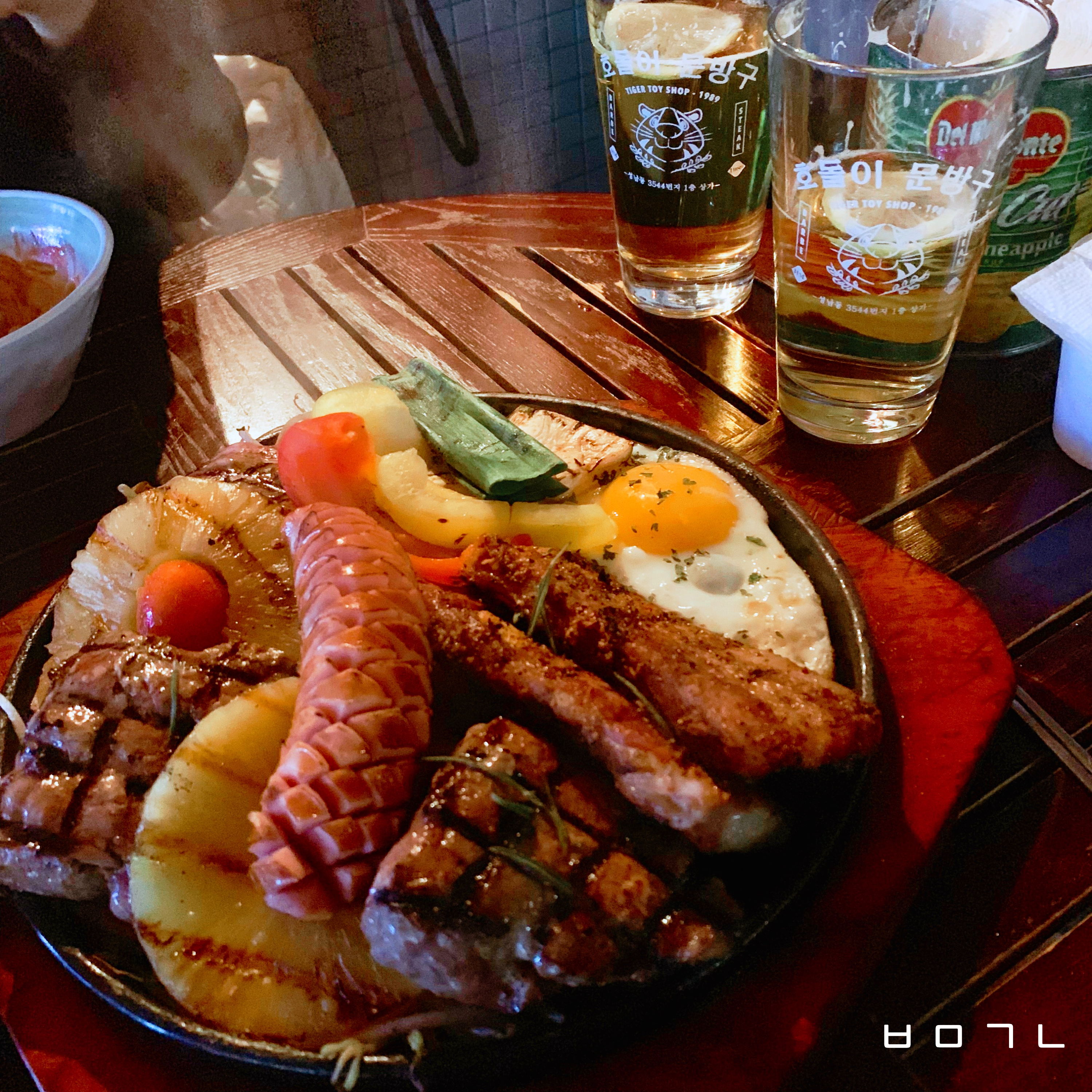 고기만 나오는게 아니라 구운 파인애플, 버섯, 계란 등등이 같이 나오고 훈제삼겹살과, 등심스테이크를 같이 나온다.